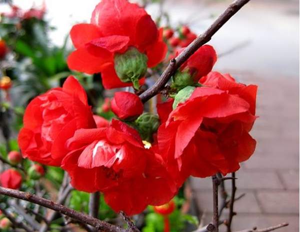 日本海棠,又名倭海棠,日本木瓜。其花與貼梗海棠極相似,只是葉稍薄。其干多叢生,多分枝,枝上有疣狀物突起,枝上有細刺。花色有大紅和粉紅色,花期3月至4月。每簇花由數朵組成,緊貼在枝上,艷麗嫵媚。花后結球形果實,黃色,果徑約4厘米。可植于庭院、路邊、坡地,也常作盆栽,置陽臺、室內觀賞。其特點為復色,為稀有自然變異品種。一株同時開出大紅、粉紅、純百或白色花中加以紅線、紅瓣、紅邊等;花繁,此花老枝、老干和當年生枝均著花,且每年著數朵,盛開時繁花似錦,極為美觀,是春節觀賞的佳品;樹型優美,此花多橫生枝,耐修剪,易于成型,是制作花卉盆景的極好樹種; 花期長 ,用簡易溫室春節前可以開花,花期2個月。露天栽培黃河流域春分前后盛開,是公園、庭院綠化的高檔花木。栽培粗放,適宜全國各地氣候和土壤。能耐低溫-32攝氏度,高溫42攝氏度。