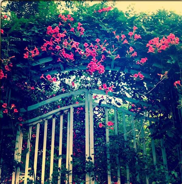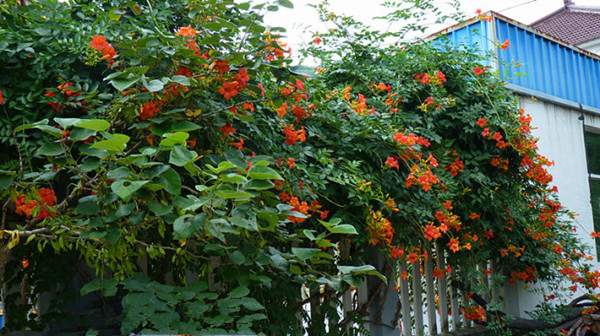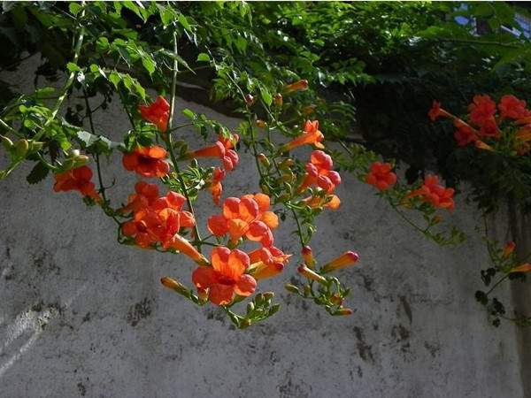 不管是仿古墻還是鐵藝墻,白墻也罷,黑柵欄墻也罷,種植一些凌霄,使其纏繞或攀援其上,可有效柔化墻體,使得籬垣更富有生機,美不勝收。