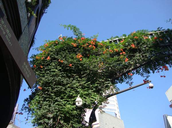 在用鋼構件制作成的圓柱周邊,種上幾株凌霄,加強水肥管理,三、兩年就可爬滿圓柱,花開時節,滿柱紅花,給人以賞心悅目之感。
